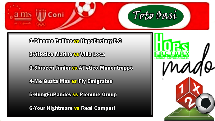 1-Me Gusta Mas vs Atletico Marino 2 2-Dinamo Pollino vs Real campari 2 3-KungFuPandev vs Fly Emigrates x 4-Your Nightmare vs Villa Loca x 5-Piemme Group vs Atletico Manontroppo 1 6-Sbrocca Junior vs HopsFactory F.C. 2 Regolamento: Questa settimana,L’Oasi Club e gli amici di HopsFactory Brewing mettono IN PALIO una MAGNUM ZIGHIGHI da 1,5l American IPA da 6,1% dal gusto...Read More